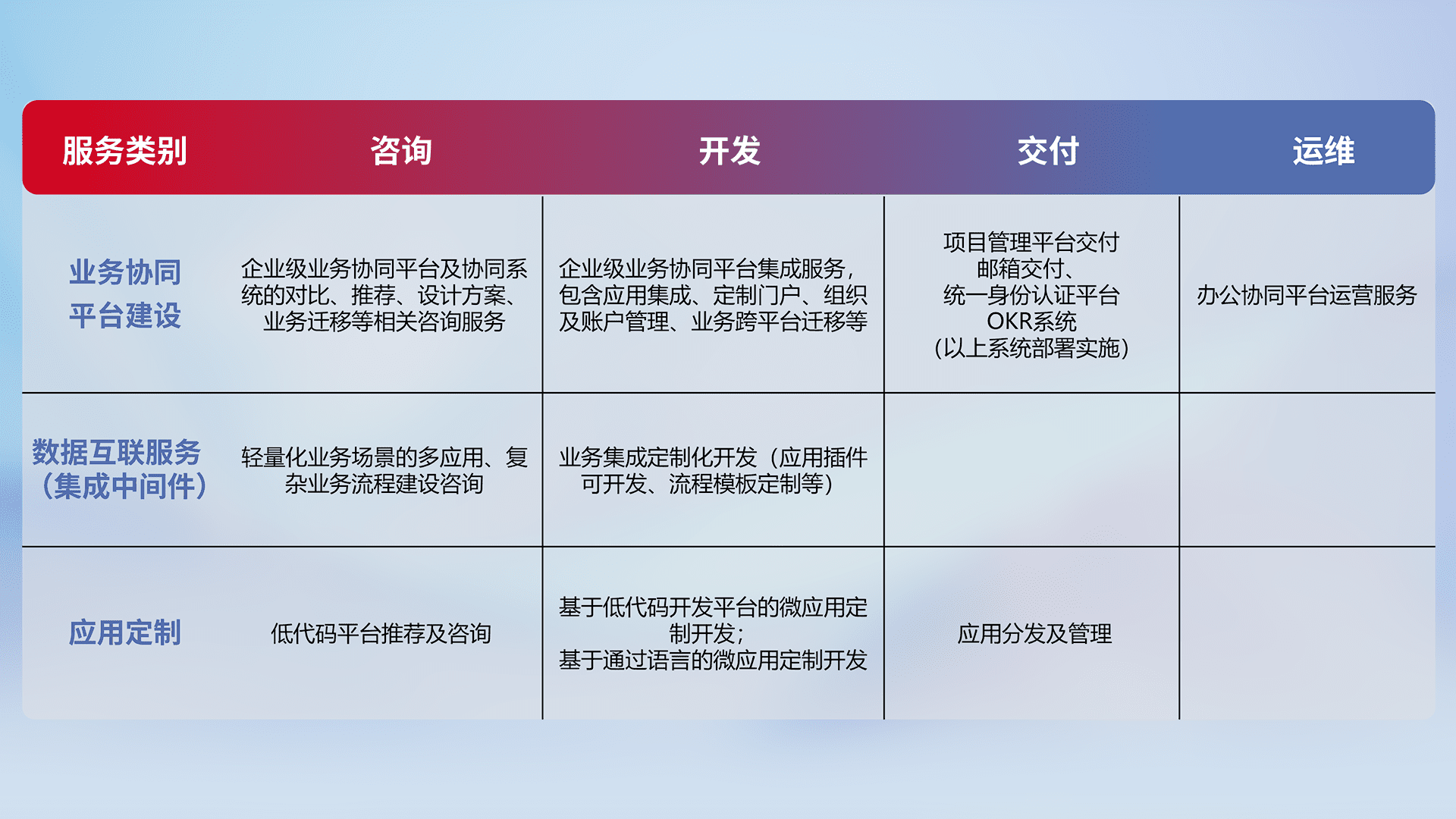 针对钉钉、、、、企微、、、、IDaas等平台级产品提供产品的规划、、、、方案、、交付、、、、定制化开发等服务,,,实现如统一协同办公、、、智能客户服务、、、混合会议管理、、智能数据查询、、、等业务场景,,实现数字化转型。。。。