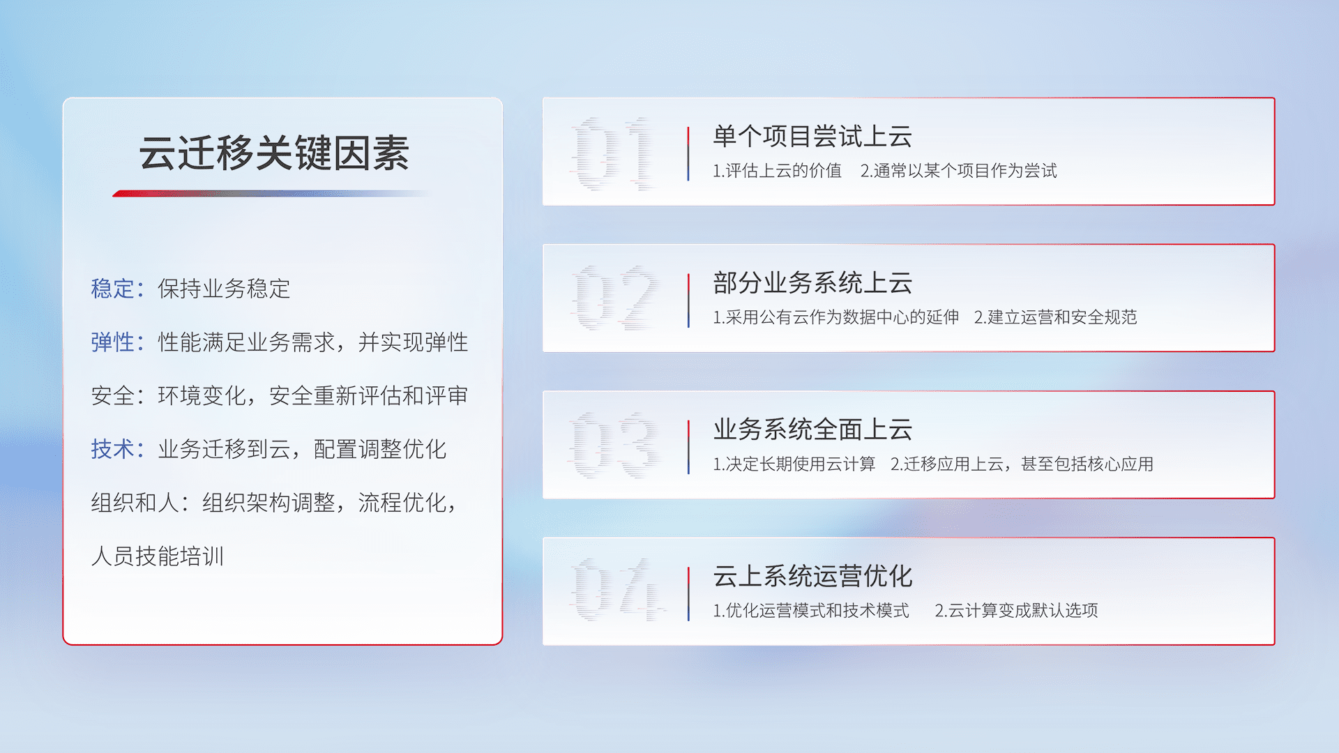 结合实际业务,,,,从规划设计、、、云平台选型、、、云原生改造、、、、数据迁移、、、、集成交付,,,迁移全过程为客户识别最佳上云路径,,,,做好风险识别管理,,,,设计网络架构、、、身份权限、、安全审计合规、、操作审计、、日志审计、、、、监控告警策略、、、多站点容灾设计等,,对云上基础设施进行整体规划,,,提升IT治理水平,,,,以满足弹性、、、高可用、、高性能的需求。。