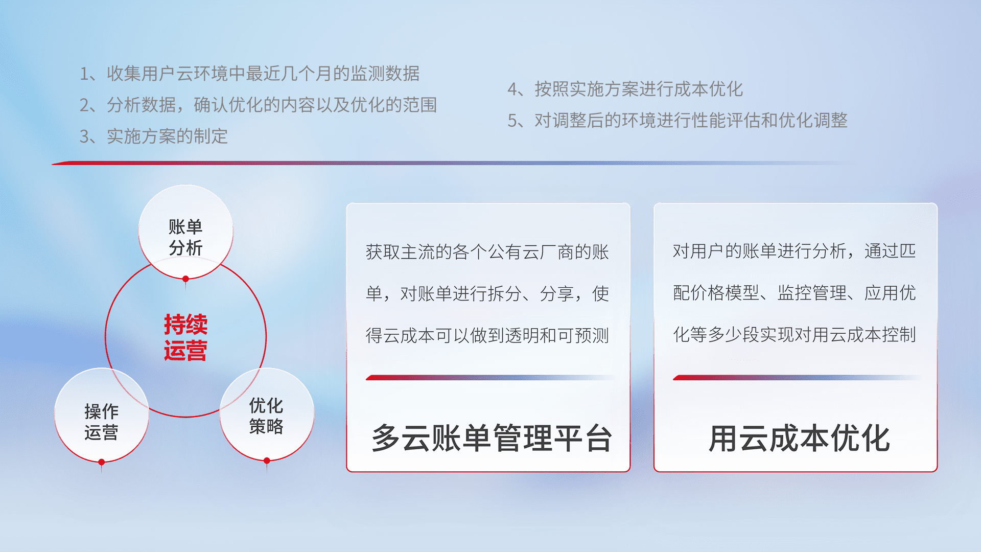 通过多云纳管,,,,以统一的资源数据模型把客户的云资源进行抽象和封装,,进而实现对多云资源的统一操作,,,,保障云资源管理的可靠性、、、、稳定性与可用性。。。。量身定制化运维内容,,配置、、、开发运维、、、补丁管理、、、备份、、、、监控、、、认证和访问管理、、审计和日常巡检等,,,,保障在用云过程中的可靠度,,稳定度以及高可用率。。。