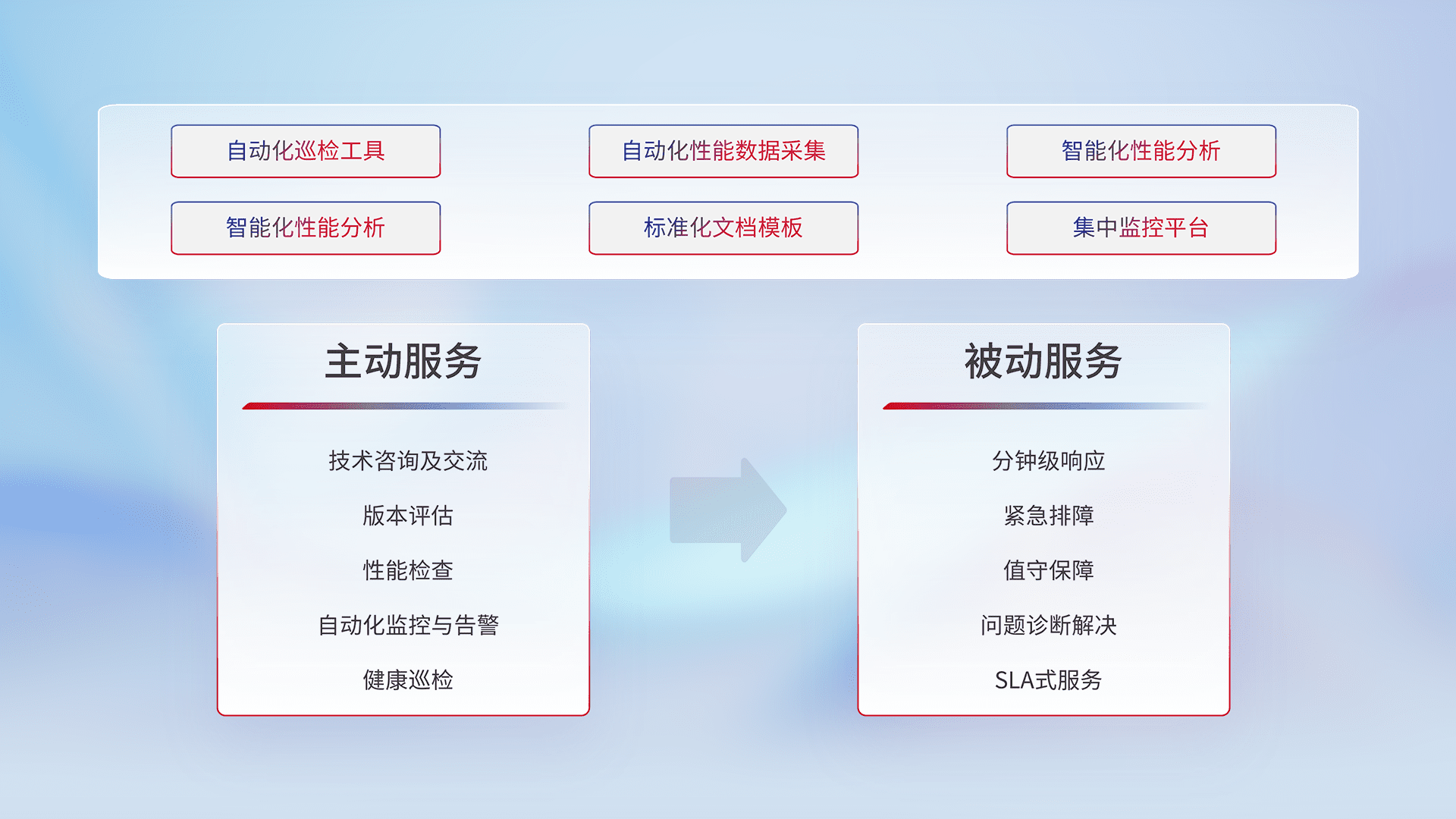 智能化工具和标准化文档,,保障服务质量,,,,提供主动服务(包含技术咨询、、、、版本评估、、、、性能检查、、、自动化监控与告警、、、、健康巡检)和被动服务包含(分钟级响应、、、、紧急排障、、、值守保障、、、、问题诊断解决、、、SLA服务)。。